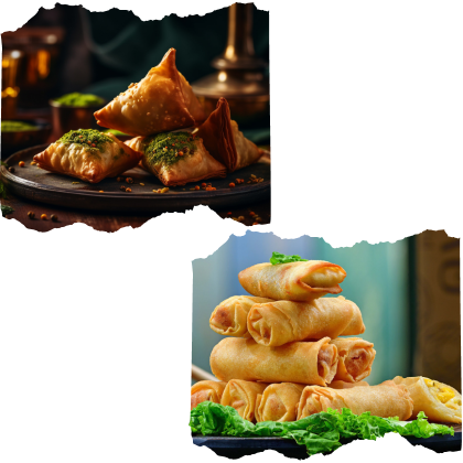 Spring Rolls are made with Pastry, Sweet Chillis sauces, Hoisin sauce, Soy sauce
